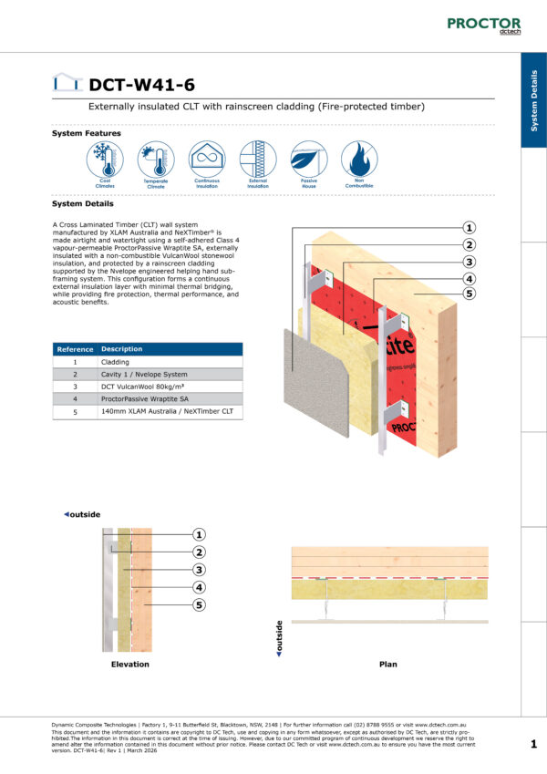 A Cross Laminated Timber (CLT) wall system manufactured by XLAM Australia and NeXTimber® is made airtight and watertight using a self-adhered Class 4 vapour-permeable ProctorPassive Wraptite SA, externally insulated with a non-combustible VulcanWool stonewool insulation, and protected by a rainscreen cladding supported by the Nvelope engineered helping hand sub-framing system. This configuration forms a continuous external insulation layer with minimal thermal bridging, while providing fire protection, thermal performance, and acoustic benefits.